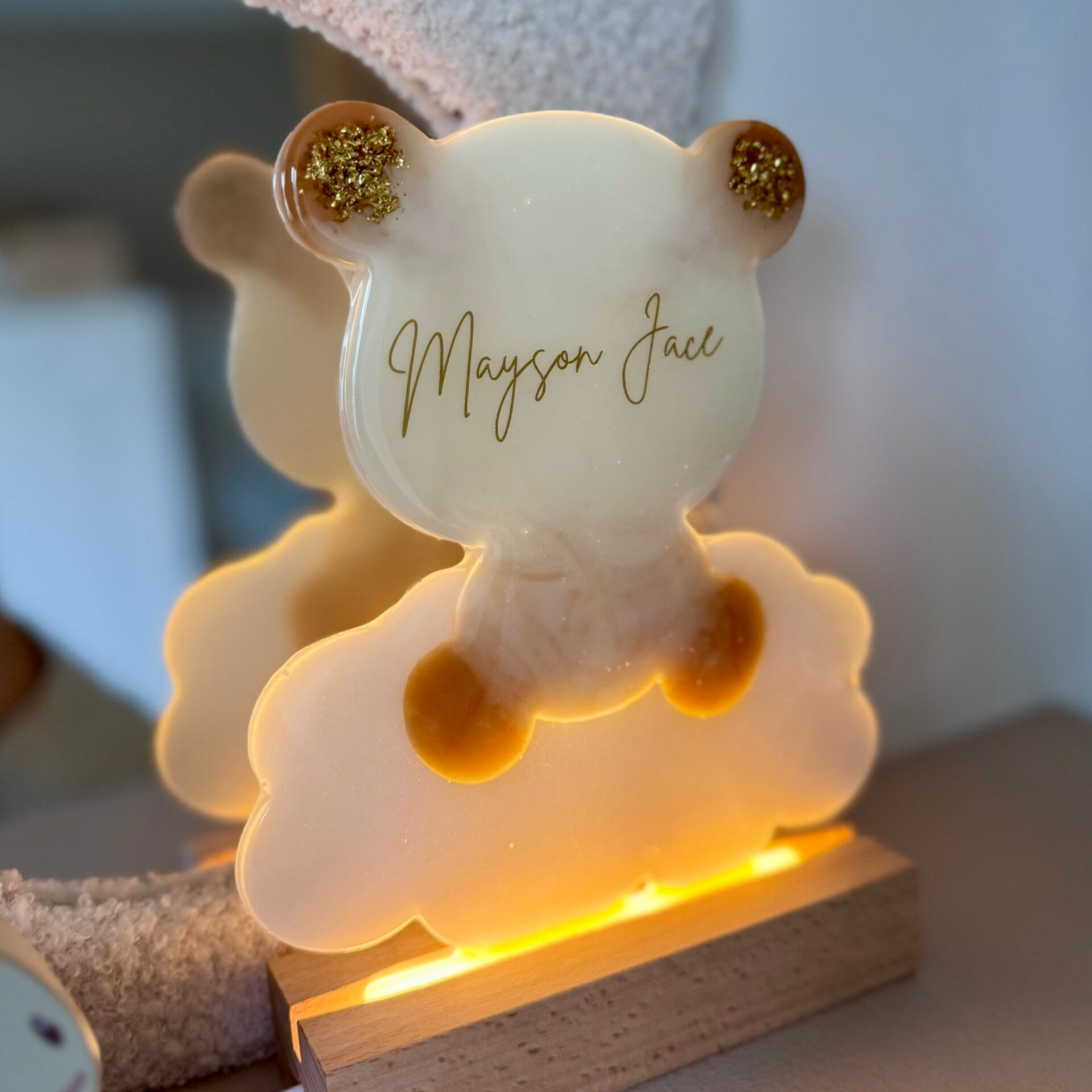 Dit betoverende lampje in de vorm van een schattige beer brengt meteen warmte in elke kinderkamer. Met zijn zachte gloed, gouden details en wolkachtige onderkant straalt het rust en geborgenheid uit, perfect voor bij het slapengaan of tijdens rustige momentjes.