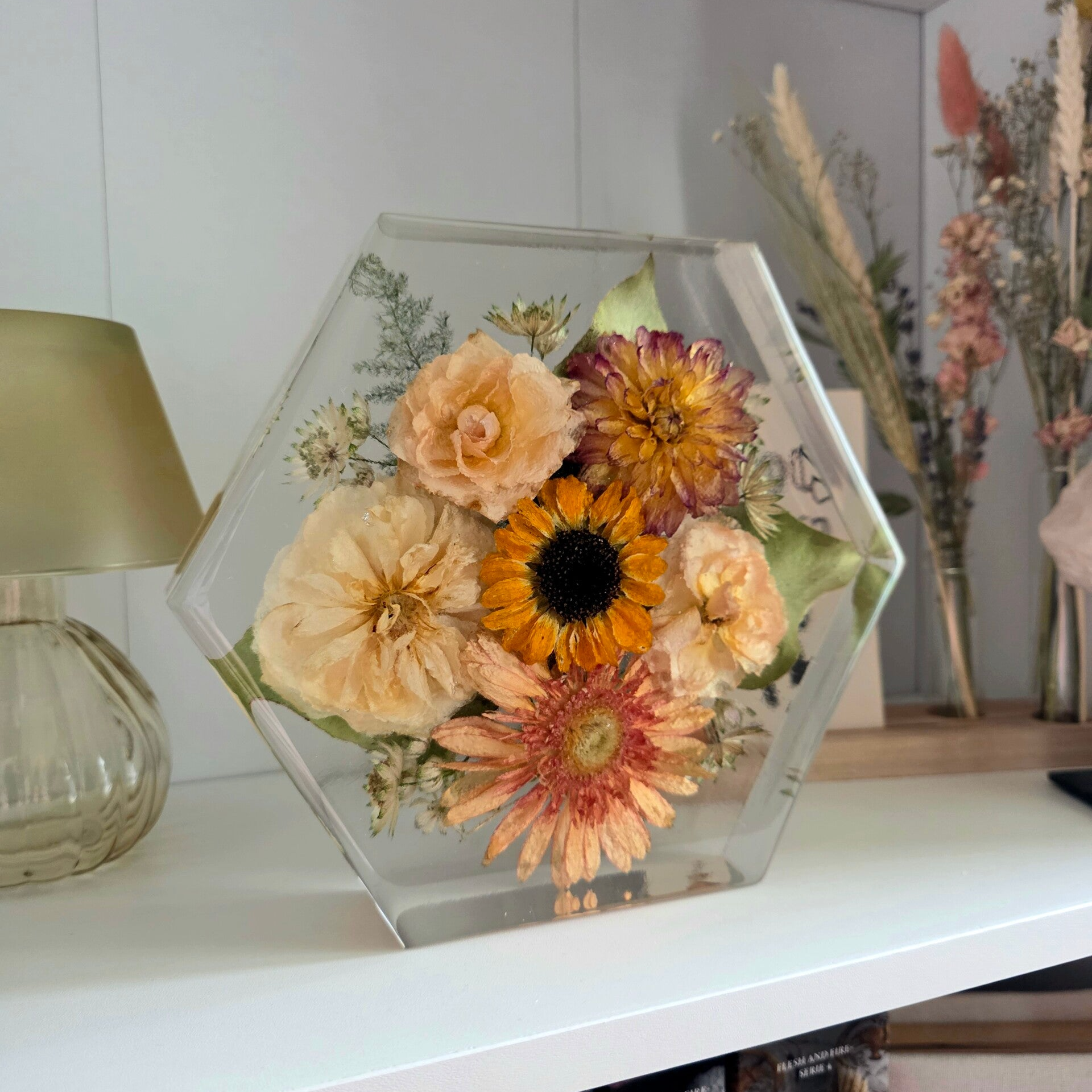Hoe wil jij jouw bloemen graag laten vereeuwigen? Wil je de Hexagon volledig opgevuld? Lijkt een vrije compositie van uit de hoeken of de onderzijde je ook mooi? Of toch liever zo veel mogelijk de originele compositie van het boeket? Kom je er niet helemaal uit? Ik adviseer je graag aan de hand van jouw bloemen.