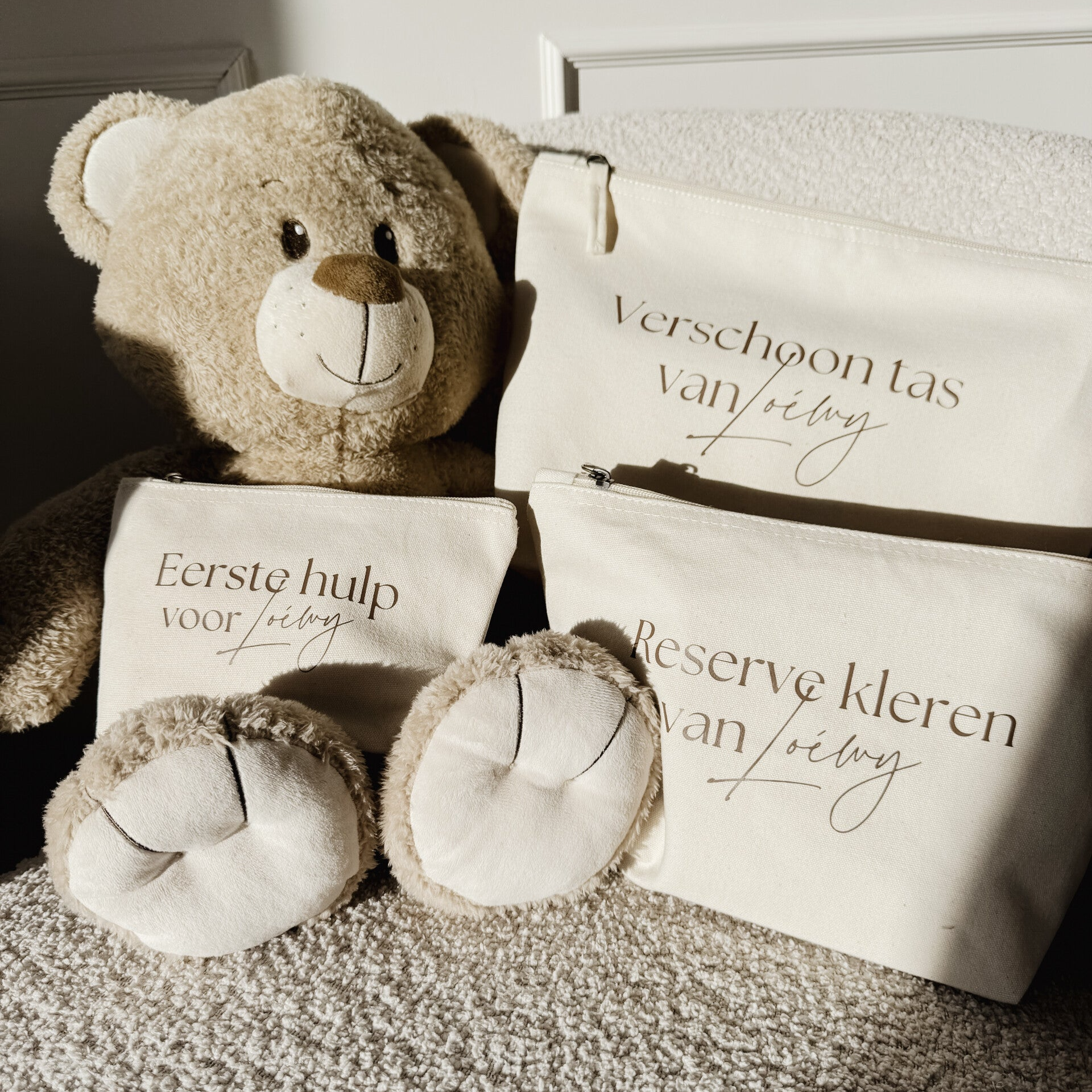 Deze etui's zijn een musthave voor in de luiertas. Verkrijgbaar in de volgende varianten: verschoon tas van, reserve kleding van en eerste hulp voor. Elk etui is geheel naar wens te personaliseren waardoor hij uniek is en geheel bij de rest van de babyuitset past.