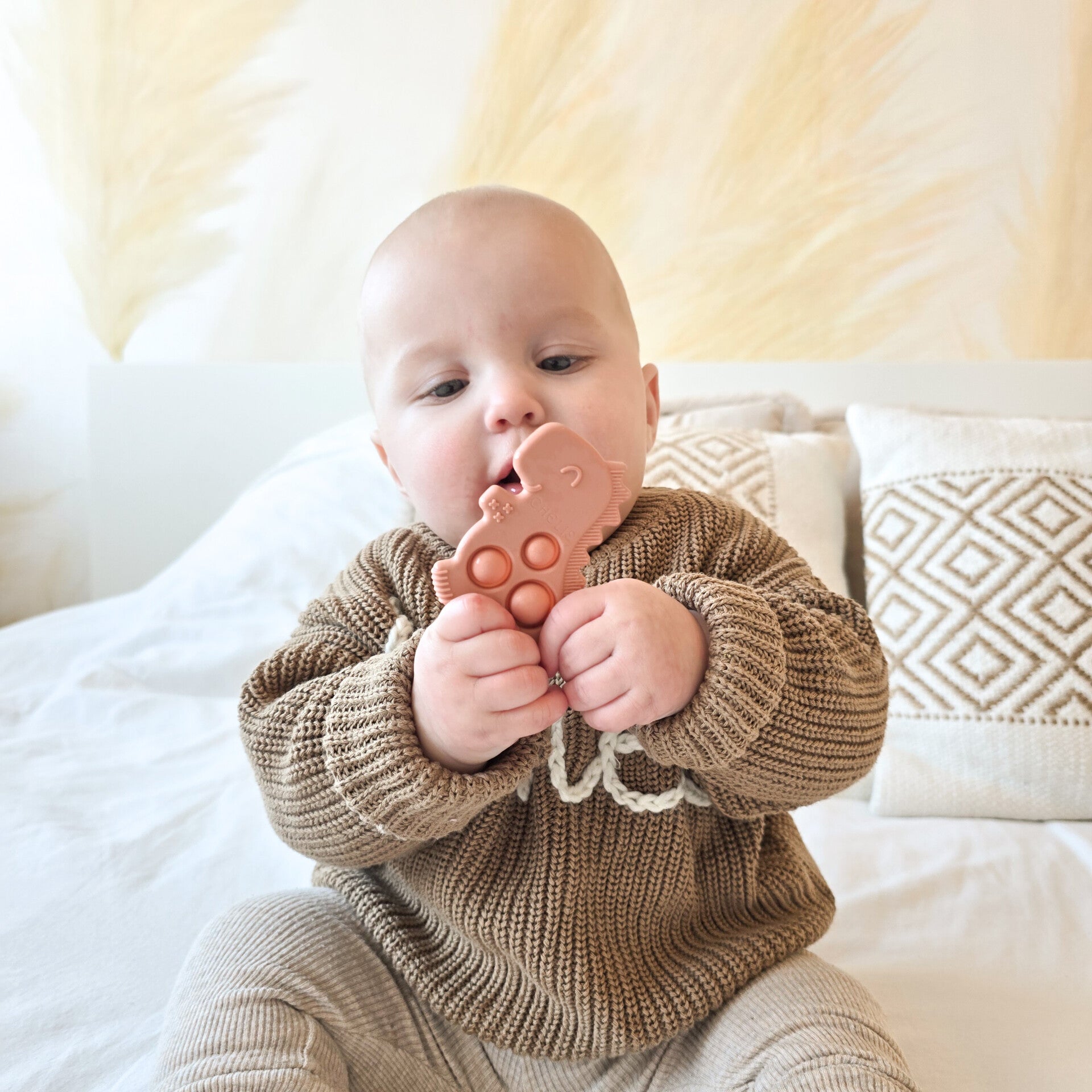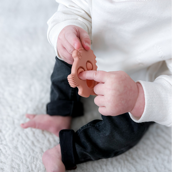 Op zoek naar een leuke bijtring voor je baby? Dan is deze leuke dino bijtring helemaal perfect! Siliconen bijtringen voor baby's zijn een veilige én effectieve oplossing voor het verzachten van de pijn bij doorkomende tandjes. Het figuurtje is koelbaar, flexibel en uitkookbaar. De bijtring helpt het geïrriteerde tandvlees van je baby te kalmeren. Daarnaast helpen zij bij het ontwikkelen van de fijne motoriek en sensorische vaardigheden.
