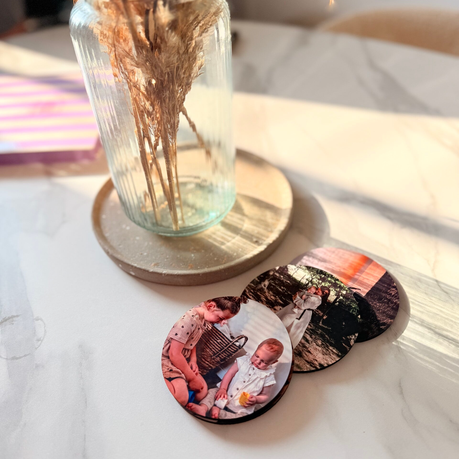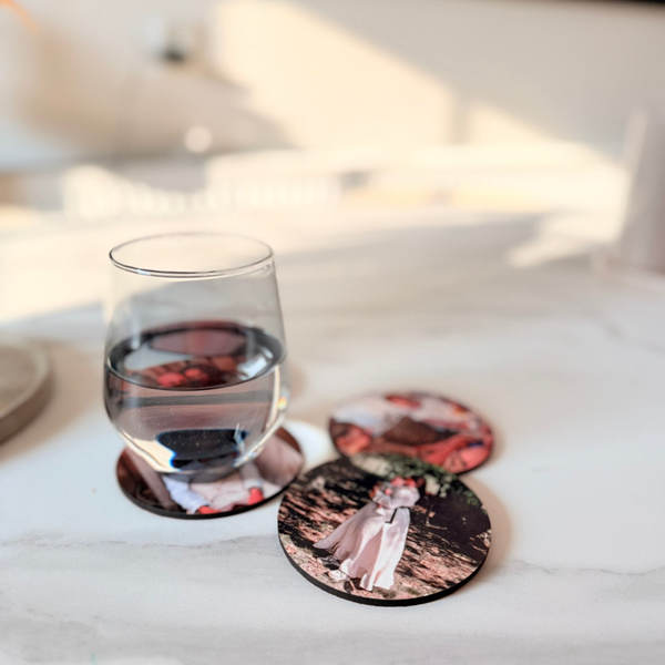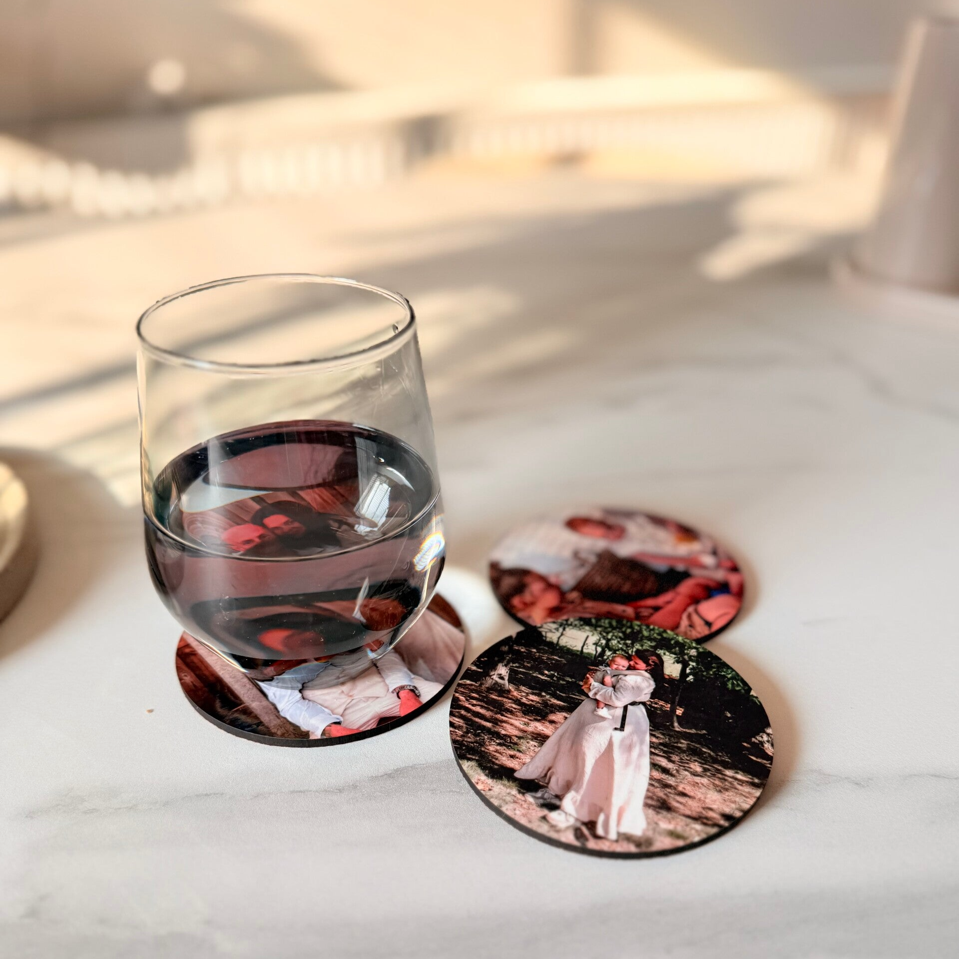 Laat je mooiste momenten schitteren op tafel! Op zoek naar een origineel én functioneel cadeau? Of wil je je eigen interieur net dat beetje extra persoonlijkheid geven? Met deze gepersonaliseerde ronde onderzetters combineer je praktisch gemak met dierbare herinneringen. Laat je favoriete foto's afdrukken op stijlvolle, ronde onderzetters en maak van elk kopje koffie een klein feestje.