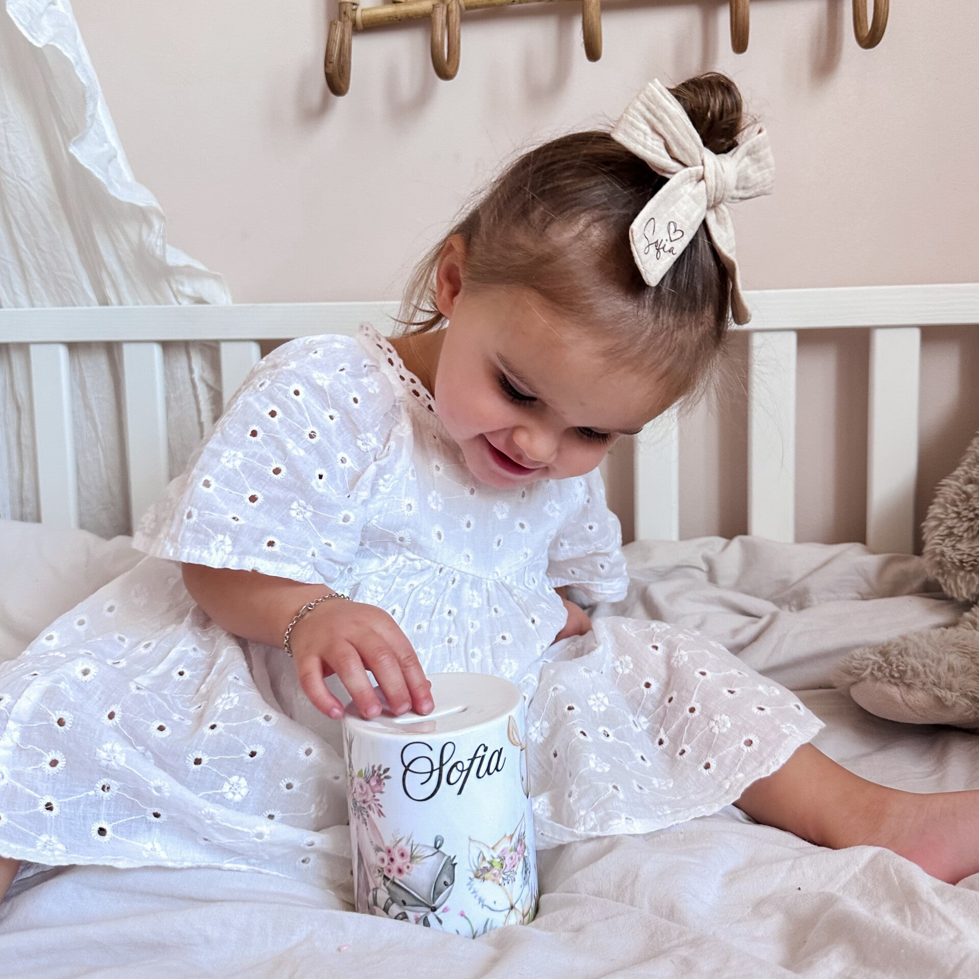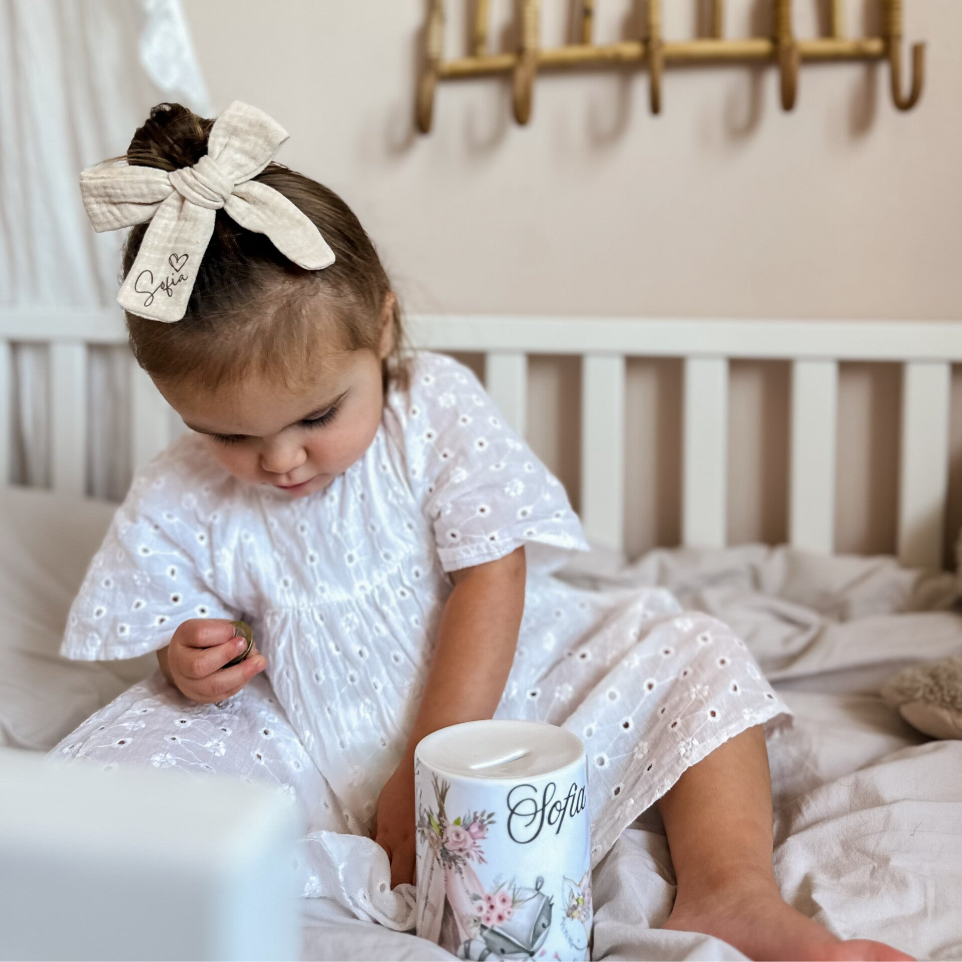 Maak sparen extra leuk met de keramieken spaarpotten met schattige, vrolijke prints. Elke spaarpot wordt met zorg gepersonaliseerd met de naam van jouw kleintje, waardoor het niet alleen een praktisch item is, maar ook een bijzonder en persoonlijk cadeau.