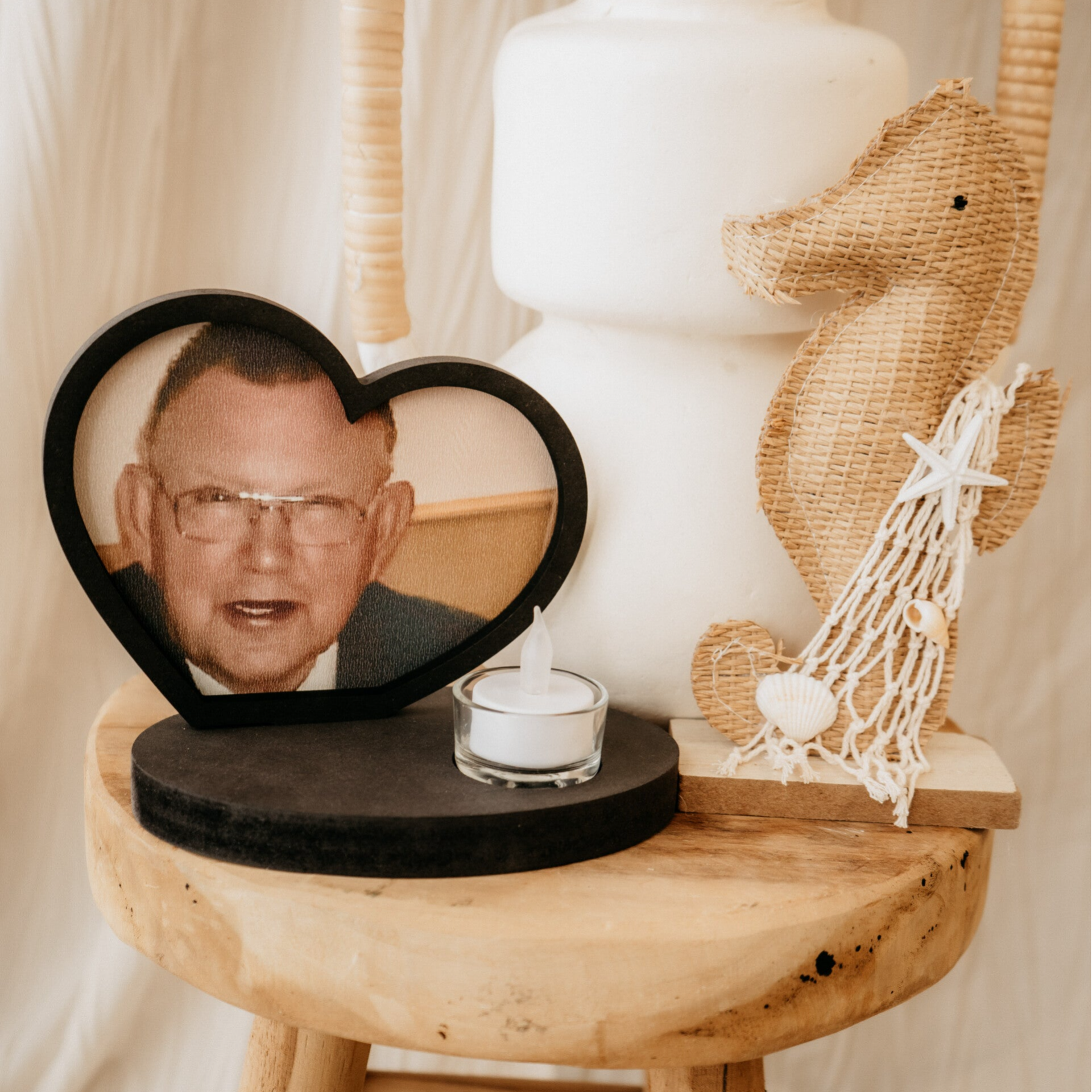 De lijst heeft een hartvormig ontwerp, symbool voor liefde en verbondenheid, en staat op een stevige ronde basis. Daarbij wordt hij geleverd met een glazen waxinelichthouder en een LED-lichtje, een zacht en warm licht dat symbool staat voor de blijvende aanwezigheid van je dierbare in je hart.