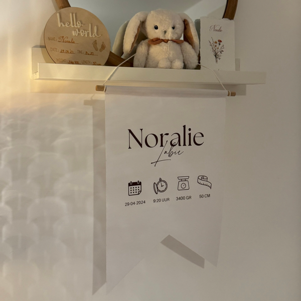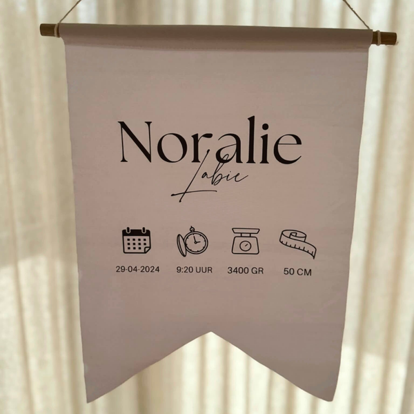 Vier de komst van jullie kleintje met een prachtig gepersonaliseerd geboorte vaandel, een unieke eyecatcher voor in de babykamer én een bijzonder aandenken voor altijd.