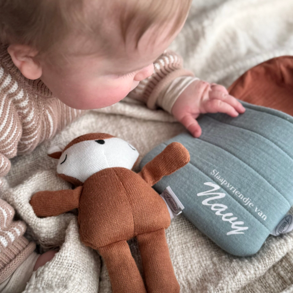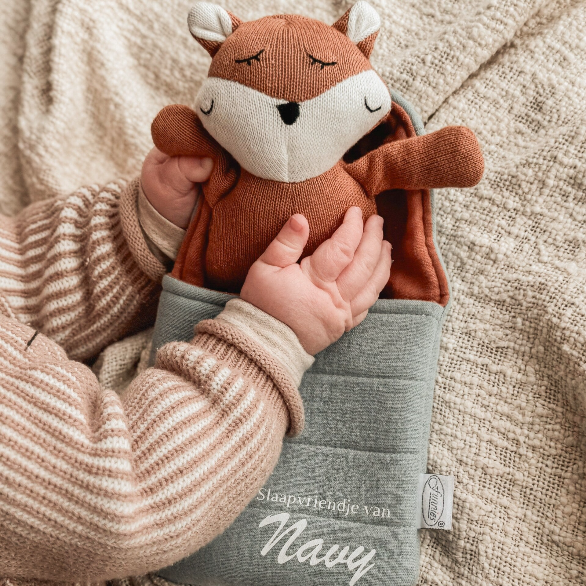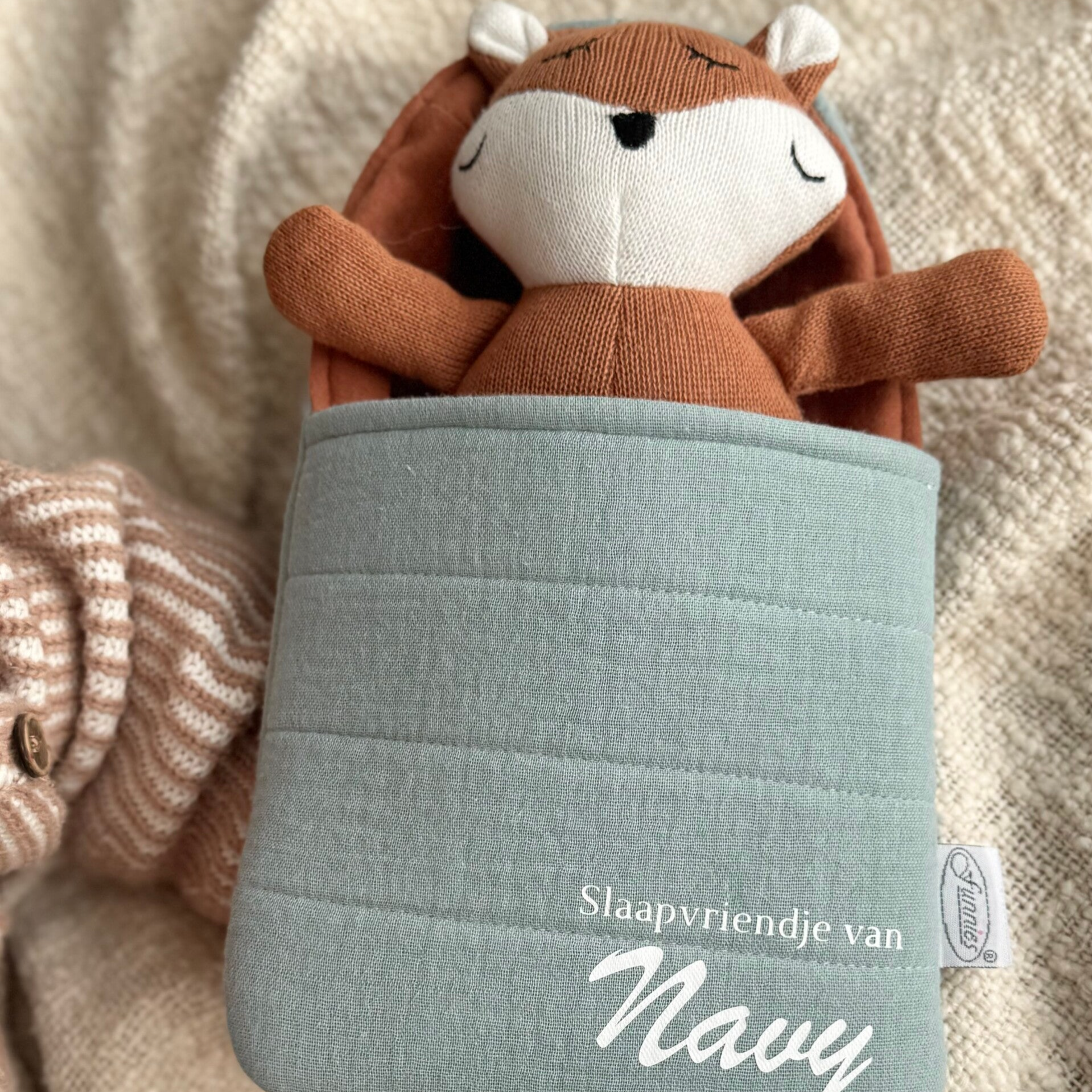 Elk slaapvriendje wordt geleverd met een matchend slaapzakje, gepersonaliseerd met de naam van jouw kindje. Dit maakt het slaapvriendje niet alleen extra bijzonder, maar ook herkenbaar en vertrouwd. Perfect voor het avondritueel, dutjes overdag of om overal mee naartoe te nemen.